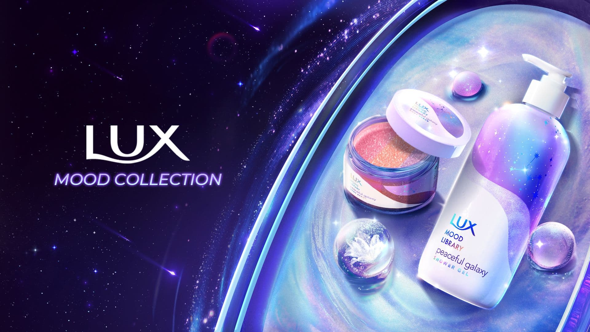Beyond fragrance, the Lux Mood Collection also engages sight and touch: the shimmering gel flows over your skin like a galaxy, while the multicolored exfoliating beads sparkle like shattered stars, creating the sensation of bathing in a new dimension – one without gravity, without pressure, where only luminous crystals gently soothe your mind.